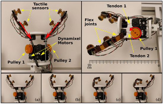 This section presents materials, methods, and experimental setup for visuotactile object pose estimation. The open source design from [20] is the basis for the present implementation. It is a modular 3D printed gripper in ABS plastic providing an easily customizable platform. Our robotic hand design is a two independently controlled fingers version mounted on top of a table. For that goal, we kept Zisimatos et al.’s [20] top plate, but a modified base accommodates two motors needed to pull each finger separately. When compared to the human hand, these underactuated robotic fingers have intermediate and distal flexible joints made of Vitaflex© 30 (Smooth-On, Easton, PA, USA). Based on Zisimatos et al. [20], this top plate, including the fingers, shows a maximum force applied (and retained) of 8 N per fingertip during tests with a standard servo. Strings are attached to tip phalanges, and two fingers are pulled independently by two Dynamixel© motors (Robotis, Lake Forest, CA, USA) mounted on a modified base. From base to fingertip, the gripper is about 20 cm long. Figure 2 shows the opened gripper during experiments before a grasp attempt. At the top, the left picture shows the four tactile sensors mounted on the finger phalanges, motors, and pulleys. This viewpoint is used to place the camera, as shown in Section 3.3. The red arrows indicate the direction of force applied by the motors. On the top right of Figure 2, a side view shows details of tendons and flex joints. A detail of the pulley one appears with a red circular arrow indicating the motor actuation direction during the pulling phase. The bottom row of Figure 2 shows steps of a single finger actuation: (a) Rest position, no motor rotation; (b) initial movement with motor pulling; (c) continuous motion brings the finger to closer to the palm; and (d) around the maximum safe finger curvature.