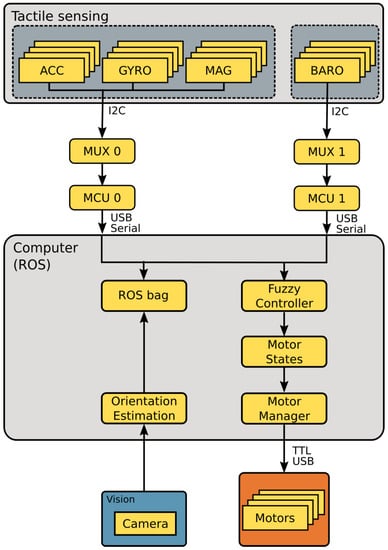 Figure 3 presents all primary ROS nodes developed for this implementation in yellow boxes inside the “Computer (ROS)” gray box. The central node runs in a laptop that concentrates control, data collection, and pose estimations. All data were collected to ROS bags for post-processing and pose orientation estimation. Figure 3 also shows the fuzzy control node that also receives sensor data and updates motor controllers. MCU 0 and MCU 1 are microcontrollers attached via serial connection to a main computer acting as ROS nodes. These microcontrollers receive data from magnetic, angular rate, and gravity (MARG) and barometer components of via I2C protocol that is represented by arrows from the “Tactile sensing” module in Figure 3, which also shows I2C communication from tactile modules multiplexed to via MUX 0 and MUX 1. There is also a USB camera represented in a blue box and a USB Serial connection from the “Motor Manager” yellow box used for computer control of Dynamixel motors represented in an orange box at the bottom of Figure 3. In the following sections, we present tactile sensing module components and organization as well as the fuzzy control system used in this experimental setup.