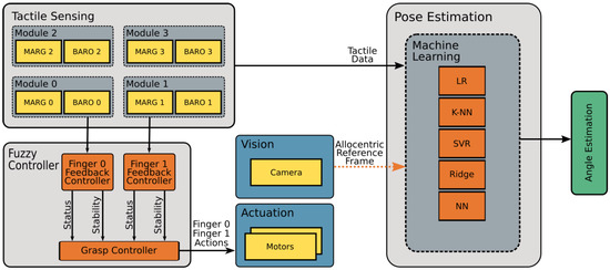Figure 4 describes a complete system flow during the experiments. Data from tactile sensing modules (top left) provided information for the fuzzy controller (bottom left) with details described in the following sections. With a grasp controller decision based on stability and status, finger actions modified the actuators’ status (blue box middle). Vision (middle blue box) provides an allocentric reference frame to the machine learning pose estimation. This allocentric reference frame used data from all four tactile modules to provide an egocentric frame of reference, which was input to the pose estimation module (right gray box). The last step was to apply five machine learning techniques and return angle estimation (green box).