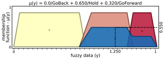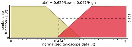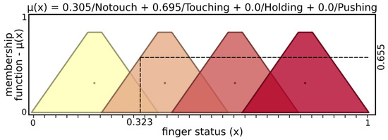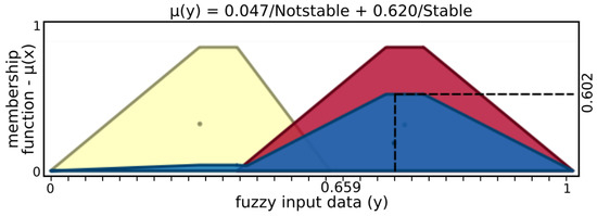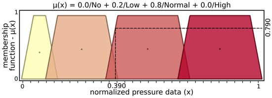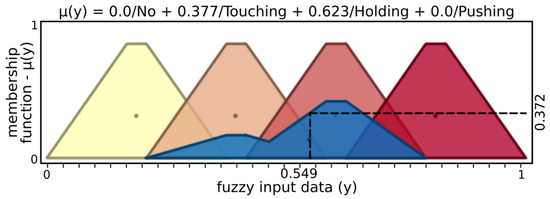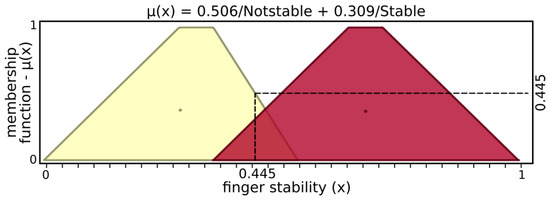 From the example above, microvibration data activate of “Low” and of “High” sets, resulting in , where is a membership function. In a similar way, the above example of pressure has with 0.2 of “Low” and 0.8 “Normal” pressure sets, while “No” and “High” sets have no participation. After inference, stability presents , activating of “Stable” and of “Nonstable”, while status has , with of “Touching” and of “Holding”.