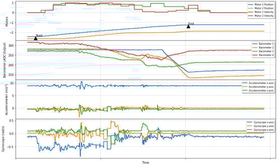 Actuator velocities during a stable grasping. Barometers, accelerometers, and gyroscopes values varying until stable grasp, followed by stabilization of sensor values.