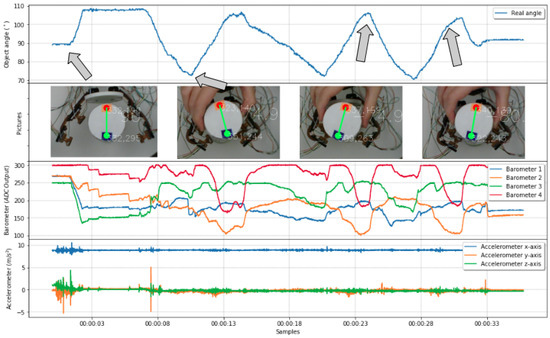 Figure 15 shows an example of sensor data collection during rotation using external forces. The angle captured by the camera shows on the first row the execution of clockwise and counterclockwise rotations, at least three times each way, which made sure that sensors were excited with all workspace possibilities for this limited setup. A set of pictures on the second row shows the human operator rotating an object, trying to promote tactile sensor exploration of the gripper workspace. Figure 15 also presents pressure information on the third row showing sensor changes while the object pose is changing. The fourth row presents the x-axis of accelerometer data, which has less amplitude but is essential to define the direction of action, information that pressure alone is not capable of providing.