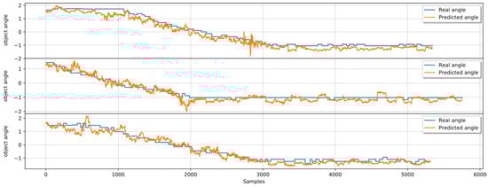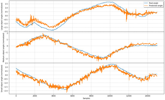 It is possible to observe that the large diameter object results on the first row show slightly less precision, with the predicted line not following the real angle line on some occasions. That observation is compatible with Table 3, where this object shows a mean squared error (MSE) of , while medium and small objects show and , respectively, for the ridge regressor, while achieving a better result using a neural network.