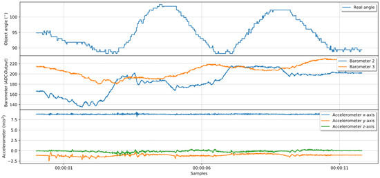 Log files (rosbags) contained angle information at 30 frames per second, with sensor data collected at its maximum frame rate. Table 3 presents results from five methods, namely: Linear regression, K-nearest neighbors regression (KNN), support vector regression (SVR), ridge regressor, and a neural network. The KNN used five neighbours and the Minkowski metric; SVR trained with the RBF kernel and degree 3; the ridge regressor was trained using ; moreover, the MLP neural network contained a single hidden layer with one hundred neurons. All method predictions used the same data features: Accelerometer, barometer, and magnetometer. Method accuracy used three metrics: Mean squared error (MSE), coefficient of determination (), and explained variance regression score (EXP) [36,37,38,39].