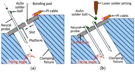 Gold–tin alloy solder balls (AuSn 80/20 wt%) were attached as solder bumps to the bond pads of the 2D neural probes by using a laser soldering machine. As depicted in Figure 2b, the neural probes with solder bumps were then placed perpendicularly in the Si platform slots. Moreover, the slots maintained the perpendicular alignment between the neural probes’ bond pads and the Si platform. Because the backbone of each probe was partially embedded in the Si platform, the entire probe array profile above the pia mater was minimized. When the probes had been perpendicularly aligned, the AuSn solder balls, which were 120 μm in diameter, were laser-soldered to the orthogonal connection. These solder bumps provided an electrical interconnection between the neural probes and Si platform. A clamping fixture with a tilting angle (α = 30°) was utilized throughout the entire lead transfer process of the solder jetting of the 2D neural probes and Si platform.