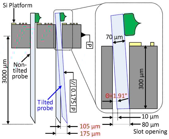 Parallelism of the probe according to the side wall (P) of the Si platform is 175 μm, as shown in Figure 3. Probe misalignment or tilting is likely considerable but can be managed by reducing the tolerance during assembly.