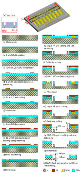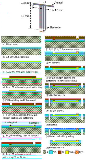 The Si platform of the 3D multielectrode probe array device served as a carrier for the 2D probes. The platform was designed with two slots of struts for probe assembly and a redistribution layer for interconnection with the flexible PI cable. The fabrication flow of the Si platform fabrication process is shown in Figure 5. First, a 1 µm SiO2 layer was deposited on a Si wafer as an insulating layer, as shown in Figure 5a,b. Thin films of 1 kÅ Ti and 7 kÅ Au were deposited on the wafer through a metal evaporation process, as shown in Figure 5c. The wafer was then spin coated with 2 µm PR, as shown in Figure 5d, and the bond pads and traces of the Si platform were patterned using the wet etching process, as shown in Figure 5e. After patterning, PR was removed using the PRS3000 solution, as shown in Figure 5f. A 1 µm SiO2 layer was deposited and 10 µm PR was coated using spin coating. The bonding pads and traces of the Si platform were defined and established after oxide etching. At this stage, PR was stripped, as shown in Figure 5g–j.