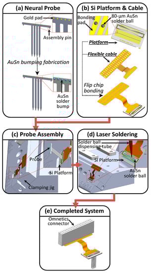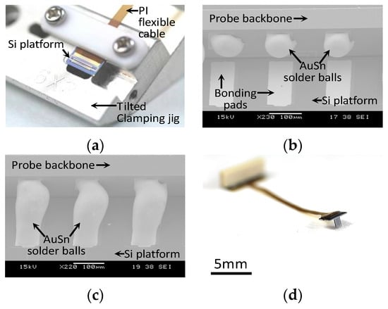Figure 6 illustrates the 3D multielectrode probe array device assembly and packaging process. The 2D probe was designed with assembly pins at each end of the backbone. These pins fixed the 2D probes in the struts of the Si platform, thereby creating a 3D structure when assembled together. Before assembling the probe with the Si platform, the bond pads of the 2D probes were attached with AuSn solder balls through a laser solder jetting process, which used the SB2-Jet machine (PAC TECH Packaging Technologies, Inc., Nauen, Germany), as shown in Figure 6a. The optimized solder jetting process parameters were as follows: laser energy of 24 mJ, current of 3500 mA, N2 pressure of 40 mbar, and pulse width of 2 ms. Figure 6b shows the integration of the Si platform and flexible PI cable. The Si platform was designed and fabricated with a bond pad space and pitch of 80 and 500 µm, respectively. The bond pads were bumped with AuSn solder balls of 80 µm diameter through the laser solder jetting process. Alongside the aforementioned bond pad space and pitch, the flexible PI cable was bonded to the Si platform by using flip-chip bonder FC150 (Smart Equipment Technology, Saint-Jeoire, France). The optimized flip-chip parameters were as follows: compression force of 800 g and bond temperature of 300 °C for 2 min. Nagase ChemteX UFR115VL underfill—a solvent-free liquid—was used to encapsulate the Si platform prior to flip-chip bonding to prevent electrical shorting between bonding pads.