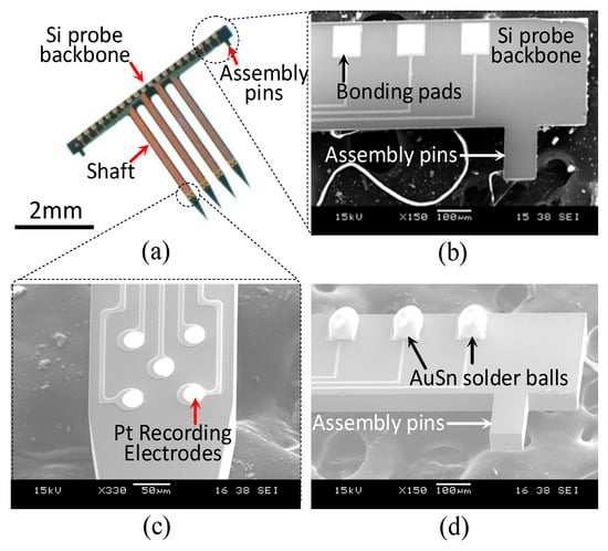 Figure 7 shows the details of the completed 2D neural probe. Figure 7a shows the actual 2D Si probe with four shafts and two assembly pins near the opposite ends of the backbone. The length and width of each shaft are 3 mm and 200 μm, respectively. The details of the backbone of the Si probe are illustrated in Figure 7b. Twenty bonding pads, corresponding to the bond pads on the Si platform for interconnection packaging, were placed on the backbone. The assembly pins anchored the probe to the Si platform. Pt multielectrodes were defined on the tip of each probe shaft, as shown in Figure 7c. To facilitate the packaging and orthogonal assembly with the Si platform, 80 μm AuSn solder balls were attached to the bonding pads of the probe backbone through laser soldering, as shown in Figure 7d.