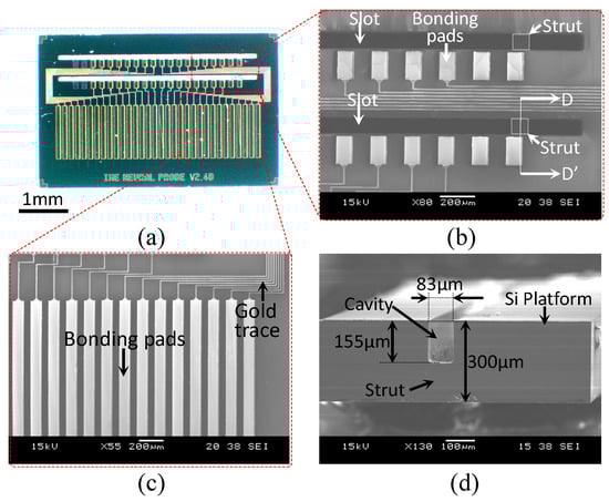 (a) Magnified photograph of the fabricated Si platform, (b) scanning electron microscopy image of the slots and struts of the Si platform, (c) bonding pads of the Si platform intended for flexible PI cable integration, and (d) scanning electron microscopy image of section D-D’, showing the cavity and strut of the Si platform (from Figure 8b).