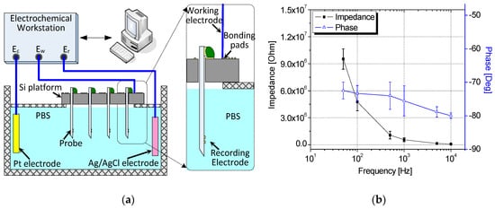 Figure 10a shows the benchtop setup for signal acquisition and impedance measurement. A custom jig was generated to connect the assembled 3D probe array with a counter electrode (Pt-based electrode) and reference electrode (Ag/AgCl electrode). All electrodes, excluding the bottom surface of the Si platform of the 3D probe array, were submerged in a phosphate-buffered saline solution. The opposite ends of the electrodes were connected to a workstation with a frequency response analyzer. Moreover, a digital multimeter was connected to the setup. In practice, electrode impedance is generally measured at a mean frequency of 1 KHz for neurophysiological activity. This is adequate to specify electrode tip properties [21]. In this set-up, impedance measurement was conducted at a frequency range of 10 Hz–100 KHz. The average impedance measured at 1 KHz was approximately 0.55 MΩ, as shown in Figure 10b.