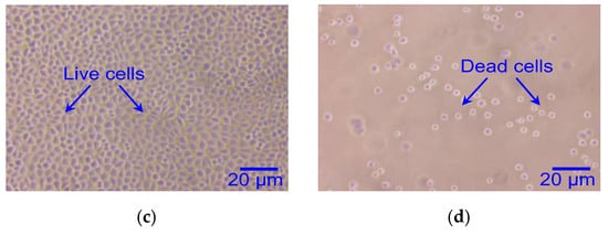 All tests were performed in triplicates. After incubation of the cell culture with the sample extracts, the samples were examined microscopically at 100 times magnification. Based on the results, the degree of cytotoxicity of the extracts from the neural device sample, HDPE, and reagent blank was Grade 0; while the positive control is Grade 4. Grade 0 means no reactivity with no destruction of cell layers and Grade 4 means severe reactivity with nearly complete destruction of cell layers. The cells that were extracted from the device shown in Figure 11a were comparable to the negative control, which was extracted from a HDPE material and reagent blank, shown in Figure 11b,c, respectively. The results indicated no cell lysis or no reduction of cell growth, a positive assessment, thereby verifying that the device is biocompatible and has no cytotoxic effect. Figure 11d shows damaged cells from the positive control extract obtained using a zinc sulfate solution.