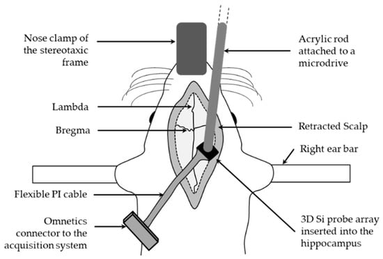 The acute terminal experiments were carried out in 3 Sprague–Dawley rats. Typically, a rat (300–400 g) was anaesthetized with urethane (0.8 g/kg) and mounted on a stereotaxic frame. All animal experiments were approved by the Institutional Animal Care and Use Committee (IACUC), National University of Singapore. A midline sagittal incision was performed, and the scalp was retracted to expose the bare skull. Burr holes were drilled relative to the bregma to target the medial septum (AP:0.2, ML: 0, DV: 5–6 mm) or the ventral hippocampus (AP: −6.5, ML: 5.5, DV: 5.5–6 mm). The 5-shank electrode assembly that was attached to an acrylic rod which in turn was held by a microdrive. The electrode was carefully inserted into the burr hole and then gradually advanced in micrometer steps into the brain to record either the LFP or spike activity similar to previously published procedures [24]. The experimental set up is shown in Figure 12. LFPs from the ventral hippocampus were simultaneously recorded from 2 channels using a preamplifier (EX4-400, Dagan Corporation, USA), digitized (CED, UK), and visualized using Spike 2 (version 7.12). The raw waveforms recorded from the ventral hippocampus were subjected to standard DC noise removal and smoothing algorithms provided by the Spike 2 software. Spike activity from medial septum was acquired using a preamplifier (ELC-03XS; NPI electronics; Tamm, Germany), digitized (Power 1401; CED, Cambridge, UK), and visualized using Spike 2 (version 7.12). Spikes were sorted according to template shape, principal component, density plot, and interspike interval histogram analysis.