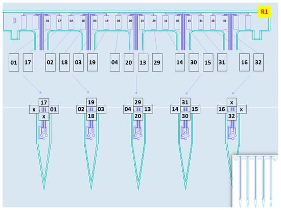 The slot depth and geometry of the 2D probe integration were defined and created using the DRIE process. A PR layer of 10 µm thickness was coated on the wafer by using SPR220—a coating equipment (Rohm and Haas Electronic Materials)—as shown in Figure 5k. The PR layer served as a mask for etching in the first step of the DRIE process. In the first DRIE procedure, which is illustrated in Figure 5l,m, Si was etched at a depth of 300 µm. The PR was then stripped using the PRS3000 solution, as shown in Figure 5n. To ensure that the 10 μm Clariant AZ5214 negative photoresist coating was uniform, an EVG101 spin or spray coating and developing equipment (EVGroup) were used, as shown in Figure 5o. The oxide layer of the struts was etched through the RIE process, as illustrated in Figure 5p. In Figure 5q, this was followed by a second DRIE process which etched out another 150 µm from the predefined slots of the Si platform. The backbones of the 2D probes were partially embedded at an etching depth of 150 µm, and the fixing slots for the 2D probe assembly pins were established. After this process, the PR was finally removed, as displayed in Figure 5r. The final thickness of the wafer after backgrinding was 300 µm, and thus the slots of the Si platform were exposed. Development of the Si platform was completed after the UV tape had been removed, as shown in Figure 5s.