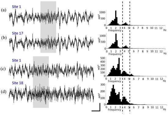 Representative plots of theta oscillation from ventral hippocampus of a urethane-anesthetized Sprague–Dawley rat. The left panel (a–d) shows raw (dark gray line) and smoothed (black line) waveforms from corresponding recording sites (Scale bar: 200 mV and 1 s), and the right panel shows FFT power spectrums generated for 150 s of data. The light-gray box in the left panel and the broken lines in right panel depict the characteristic theta oscillations caused by urethane.
