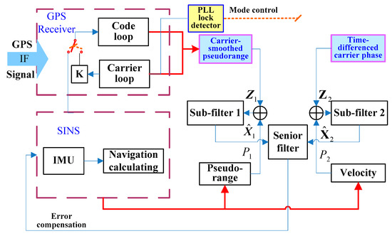 The error characteristics of global positioning systems (GPSs) and strapdown inertial navigation systems (SINSs) are highly complementary. GPS/SINS integrated systems have the advantages of both GPS and SINS [1]. According to different data fusion strategies, the GPS/SINS integrated system can be implemented in three modes: with loose, tight, and ultra-tight integration [2]. Ultra-tight integration has become the main direction of GPS/SINS integrated systems due to its superior dynamic performance and anti-jamming capability [3]. GPS/MEMS-SINS integrated systems are important in military and commercial applications due to their low cost, small volume, low power dissipation, lightweightness, and high reliability [4]. In GPS/SINS ultra-tight integration, both the tracking loop filter output and the Doppler-assisted information are used to generate control instructions for the numerically controlled oscillator (NCO) [5]. Consequently, the dynamic performance of the GPS receiver is improved by reducing dynamic stress, and its loop thermal noise is restrained by reducing the loop bandwidth [6]. However, the response of the loop filter to tracking error is limited. The tracking loop is more dependent on the Doppler-assisted information for controlling the NCO, and the loop is more sensitive to the Doppler-assisted error [7,8]. There is a relationship between the accuracy of Doppler-assisted information and the MEMS-SINS device quality. As a consequence, low-precision MEMS-SINS-assisted information would mislead the tracking loop and result in tracking loop lock loss. This causes GPS measurement error to be correlated with the MEMS-SINS velocity error, and the correlation results in the decrease in the estimate precision of the integrated Kalman filter (IKF).