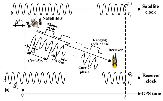 where is the pseudo-range measurement; is the carrier phase measurement; is the distance between the satellite and the GPS receiver; is the wavelength of the L1 carrier frequency; and are the ionosphere and troposphere delay equivalent range errors that belong to the transmission error, respectively; and are the GPS receiver clock error and satellite clock error, respectively; is satellite orbit error that belongs to the control segment error; and are the multipath error and measurement noise, respectively; is the integer ambiguity; and c is the speed of light in a vacuum.