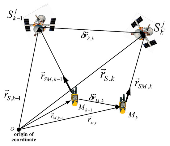 Figure 3 shows that is the distance variation from epoch k − 1 to epoch k. is the variation in the geometric relation of the observed satellite and the GPS receiver caused by the change of the LOS vector.