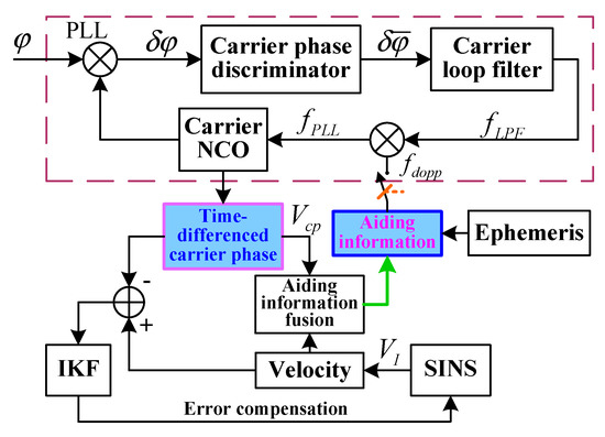 Thus, using high-precision GPS TDCP velocity estimation to aid the tracking loop would reduce the carrier Doppler frequency error and the correlation between the GPS measurement error and the MEMS-SINS velocity error. Integrating high-precision GPS carrier phase measurements and MEMS-SINS would improve the accuracy of the GPS/MEMS-SINS integration. Therefore, this paper presents an innovative scheme for a carrier phase differential GPS/MEMS-SINS integrated system. TDCP velocity-assisted information is used to overcome the problem of large Doppler-assisted error caused by low-precision MEMS-SINS. High-precision TDCP velocity and carrier-smoothed pseudo-range (CSP) are used as the IKF measurements to enhance the dynamic performance, anti-jamming capability, and accuracy of navigation.