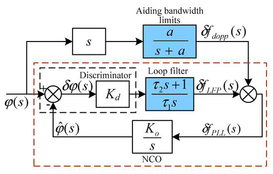 Model of TDCP velocity-assisted PLL tracking. Where is the phase of the input carrier signal, is the local carrier signal phase, is the phase error between the local carrier and the input carrier, is the Doppler-assisted error, is the loop filter output, and is the PLL frequency-tracking error. is the low-pass filter used to limit the bandwidth of SINS. The loop filter is an ideal integral filter, , where and are the time constants of the filter, is the gain of the discriminator, and is the gain in NCO.