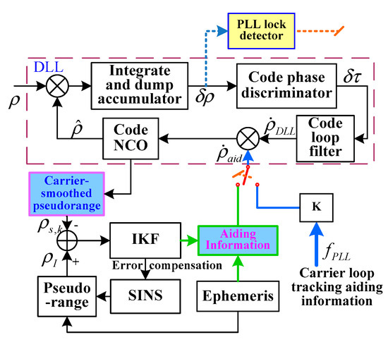 The principle of assisted DLL involves using PLL frequency estimation to assist the code loop. The PLL loop filter output is transformed by a scale factor into the assisted DLL code rate to maintain the DLL locking bandwidth when the carrier loop is locked. Therefore, the loop gain can be reduced and the anti-jamming capability of the code loop can be enhanced. However, the DLL with a closed-loop structure tracks drift error caused by the carrier Doppler-assistederror. When the carrier loop loses lock, the assisted mode is switched to the MEMS-SINS-assisted code loop. The MEMS-SINS velocity information corrected by IKF and the output of the code loop filter are combined into a driving signal to control the predicted signal delay. The code loop would only track the remaining frequency error. The code loop works in narrow band mode to enhance the loop’s anti-jamming capability.