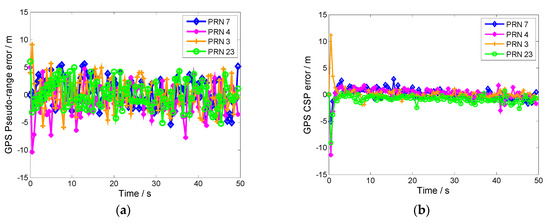 High-precision navigation measurements can be obtained by CSP. The errors of the GPS conventional pseudo-range and CSP are depicted in Figure 9a,b, respectively.