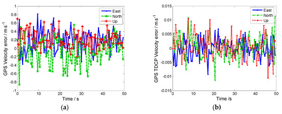The high-precision velocity of the aircraft can be calculated using high-precision carrier phase measurements. The GPS TDCP velocity and GPS conventional velocity are shown in Figure 10a,b, respectively.