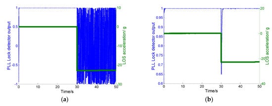 In the simulation, the aircraft experienced a step acceleration of 30 g from 30 s to 50 s, which corresponds to a step acceleration of −22.8 g along the LOS vector for channel 2. The simulations of conventional and ultra-tight integration under these conditions are shown in Figure 11a,b, respectively.