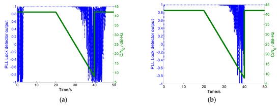 where ; PIT is the predetection integration time, and its value can be selected as 1, 2, 5, or 10 ms; is the prompt output of the in-phase branch; and is the prompt output of the orthogonal branch. The threshold of the PLL lock detector is 0.7. The threshold is set when at least 85% of the signal energy is mainly in the in-phase I branch. If the output is less than 0.7, carrier loop lock loss occurs [20].