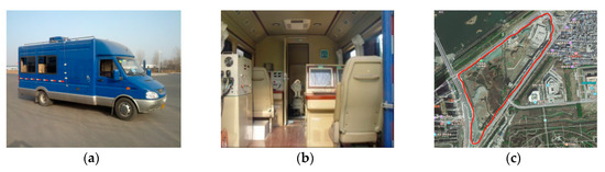 Test platform. (a) Mobile test vehicle, (b) internal test equipment, and (c) trajectory on map shown by the red line.