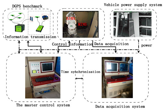 The land vehicle system is shown in Figure 13 and Figure 14. As the test benchmark, the land vehicle had a master inertial navigation system (MINS) and a high-precision differential global positioning system (DGPS), which employed JNSGyro-4T produced by JAVAD, the positioning accuracy of which can reach 1 cm. The land vehicle system was controlled by the master control system, and the integrated navigation system was installed on a vehicle-mounted turntable. The integrated navigation system was initialized by the master inertial navigation system, and the data acquisition system recorded the output of the integrated navigation system and test benchmark. The difference between MINS-DGPS and SINS after the lever arm and time delay compensation could be used to evaluate the navigation accuracy. Figure 13c shows the dynamic trajectory of the vehicle obtained from the GPS.