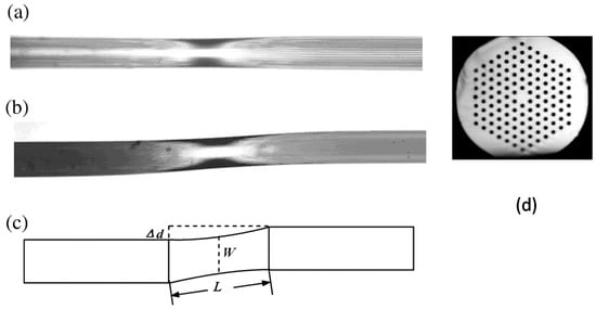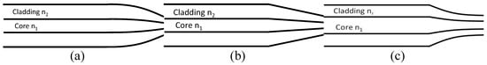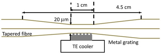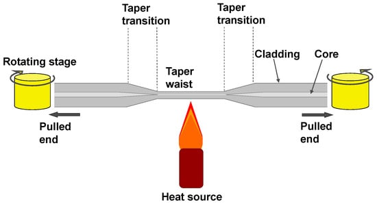 As stated, the geometry of the tapered fibre plays a crucial role in its performance as a sensor, with smaller diameter taper waists providing the higher sensitivity [21,22,23,24]. Typical taper profiles are shown in Figure 2.