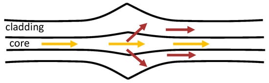 A schematic illustration of the inline double-pass Mach–Zehnder interferometer (MZI); arrows indicate excited cladding modes of the length of fibre separating the two tapers, creating different optical path lengths for higher order modes traveling in the cladding and fundamental core mode travelling in the core. Reprinted from [37] under creative common free licence (http://creativecommons.org/licenses/by/4.0/).