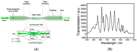 Depending on the taper geometry, optical fibre tapers can be divided into adiabatic and non-adiabatic types: if the angle of the taper transition region is small and the cylindrical symmetry of the optical fibre is retained, resulting in most of the optical power remaining in the fundamental mode the tapers are considered adiabatic; if the optical power is coupled into higher order modes the tapers are non-adiabatic tapers. For non-adiabatic tapers of diameter less than 10 μm, the linearly polarised, LP01, mode of the single mode fibre generally couples to the HE11 and HE12 modes of the tapered waist [35,47], which propagate with different effective indices along the taper waist and interfere when recombine at the second taper transition (Figure 5a). The corresponding channelled spectrum is shown in Figure 5b.