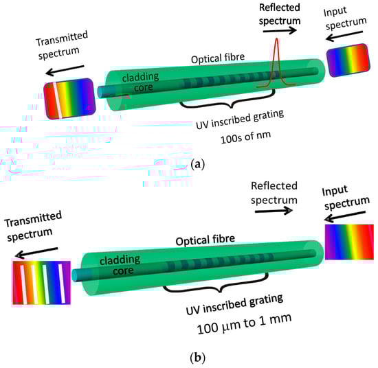 Schematic illustrations of: (a) a fibre Bragg grating (FBG) and (b) a long period grating (LPG). Reprinted from [37] under creative common free licence (http://creativecommons.org/licenses/by/4.0/).