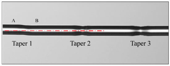 Micrograph of a tapered long period grating TLPG with three micro-tapers. Taper 1 has a distorted profile. The fibre at position A is offset from the fibre axis compared to position B. The centre axis of the fibre is shown as a dashed red line. SM750 fibre was used (magnification × 10); Reprinted with permission from [55]. Copyright 2018 Elsevier.
