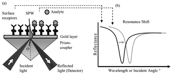 (a) Schematic illustration of the surface plasmon resonance (SPR) sensor configuration employing prism for surface plasmon excitation; and (b) shift in resonance features (wavelength or incidence angle) caused by the binding event [59], (Reprinted with permission. Copyright 2007 Elsevier).