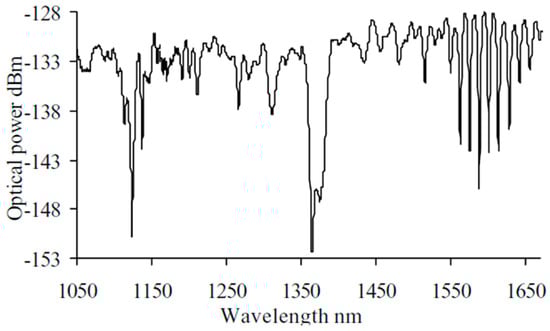 It is also possible to create modal interferometers by combining LPGs with tapers. For example, an LPG fabricated in a section of tapered optical fibre can be used to excite selectively cladding modes that subsequently interfere at the second transition region with the light that propagates through the core. This produces a channelled spectrum within the envelope of the resonance bands of the LPG, such as that shown in Figure 9. Rather than relying upon the fabrication of small diameter NATOFs, such modal interferometers can be created in tapers of larger diameter, which can be easier to fabricate and be more robust. An LPG with a grating period of 400 μm and of length 5 cm was fabricated in a biconical fibre taper with 34 μm diameter and 3.2 cm length made from standard step-index optical fibre, producing the channelled spectrum illustrated in Figure 9. A resolution of 1 × 10−4 RIU for refractive indices in the range of 1.30–1.34 was reported [66].