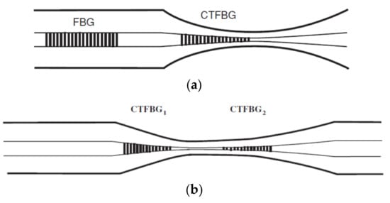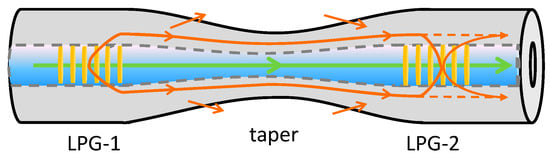 Mach–Zehnder-like interference effects have been observed when LPGs with period larger than 300 μm were inscribed in a tapered fibre with a waist diameter of 25 μm. The devices exhibited a RI resolution of ±8.5 × 10−5 RIU for solutions with indices in the range of 1.330–1.335 [64]. The fabrication of a pair of identical, cascaded LPGs separated by a section of optical fibre to create an in-fibre Mach–Zehnder interferometer (MZI) has been investigated for sensing applications. The light coupled into the cladding by the 1st LPG is recoupled into the core by the 2nd LPG to interfere with the core mode, creating the interferometer. The sensitivity of such devices to changes in the surrounding RI can be increased if the section of fibre separating the LPGs is tapered, as illustrated in Figure 10, as the RI sensitivity of the cladding modes’ effective indices is enhanced [67]. A resolution of 5.8 × 10−6 RIU was achieved, assuming the measurement system has a spectral resolution of 1 pm.