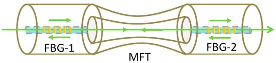 One of the significant advantages offered by FBGs is the ability to wavelength-division-multiplex a serial array of FBGs in a single length of optical fibre. This was exploited to measure RI by splicing a tapered multimode fibre between two lengths of single mode fibre (SMF, Corning SMF28), each of which contained an FBG, as illustrated in Figure 11. Two FBGs (FBG1 and FBG2, Figure 11) with different Bragg wavelengths were used for signal demodulation. Changes in the RI influenced the attenuation of the tapered section of the fibre, which modified the intensity received from FBG2. The intensity difference between the two FBG signals was used to determine the change of RI of the medium surrounding the multimode fibre taper (MFT). Monitoring the Bragg wavelengths allowed the temperature to be measured. Experimental results showed that the sensor possessed a tailorable sensitivity to the change of the external RI by controlling the taper waist diameter [69].