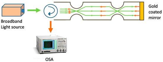 Approaches based on, for example, in-fibre gratings, non-adiabatic tapers, regions of core mismatch and directional couplers may be employed to create regions where two modes are excited and subsequently recombined to interfere [44,45]. Interference between modes results in the channelled spectrum measured by spectrometer and the phase of the channelled spectrum dependents on the difference in the optical path lengths of the interfering modes, according to [37,46]: