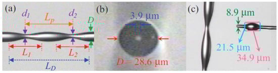 Photographs of (a) MZI with two micro-abrupt-tapers in a cladding-reduced Er/Yb codoped fibre; LP, length of the spanning fibre (between the centres of the adjacent abrupt tapers); and LD, lengths of the interferometer; L1, length of the first taper, L2 length of the second taper and d1 and d2 diameters of the taper one and two respectively; (b) cross-sectional views of the cladding-reduced Er/Yb co-doped fibre; and (c) 6.3-pL liquid drop is approaching the micro-abrupt-taper [72]. (© 2012 IEEE. Reprinted, with permission from [72]).