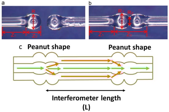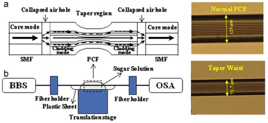 A temperature-independent refractometer based on an MZI fabricated by sandwiching a tapered photonic crystal fibre (PCF) of length 29 mm between two standard telecommunications SMFs, with the air holes of the PCF fully collapsed in the fusion spliced regions (Figure 15), was investigated [80]. It was found that tapering the PCF greatly enhanced the sensitivity of the refractometer. A maximum sensitivity of 1529 nm/RIU was achieved over an RI range from 1.3355 to 1.4130. The refractometer was found to be nearly temperature-insensitive due to the ultra-low temperature sensitivity of the PCF. In a similar configuration, a sensitivity of 1600 nm/RIU was reported, which is nearly eight times as high as that of an un-tapered PCF interferometer [81] and 20 times higher than that reported for an S-tapered PCF interferometer [82]. A recently reported MZI based on PCF for RI sensing achieved a sensitivity of 1426.70 nm/RIU in the range of 1.3917–1.4204 [83] and 281.6 nm/RIU in the range of 1.3333–1.3737 [84].