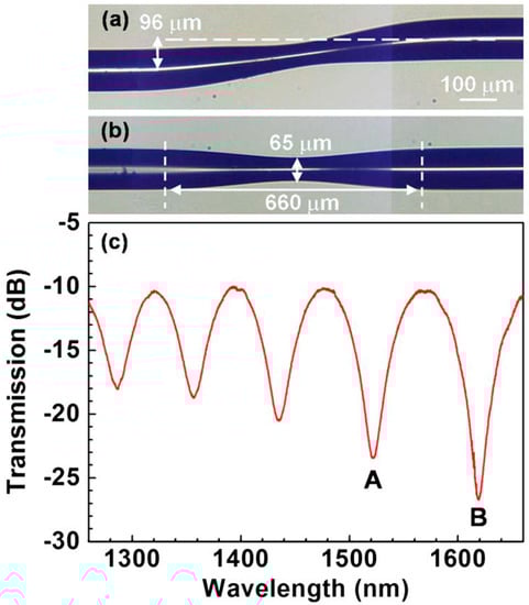 An MZI sensor composed of a waist-enlarged taper-pair (WEBT) (Figure 14) and an embedded down-stretching-bitaper (DSBT), where the waist enlarged tapers excited high-order cladding modes and the DSBT enhanced the evanescent field, was proposed by [21]. By employing the interaction between the strong evanescent field of the high-order cladding mode and the ambient environment, an RI sensitivity of 86.565 nm/cm/RIU was achieved over the RI range from 1.3332 to 1.4140. This sensitivity is about an order of magnitude higher than that of waist-reduced taper-based in-fibre MZIs [21].