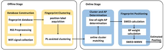 The overall architecture of the proposed method is shown in Figure 1. In the offline stage, to reduce the influence of fading and shadowing on WiFi signal and make the RSS smoother, the original RSS observations are preprocessed. The traditional RSS-based clustering cannot well reflect the position distribution of RPs, to deal with this problem, we propose the position label-assisted (PL-assisted) clustering algorithm. We first implement the coordinate-based clustering using the k-means algorithm, and the clustering results are taken as the position labels of the RPs. Then, using the position labels as auxiliary information, all RPs are clustered by the Learning Vector Quantization (LVQ) algorithm. This process ensures that the clustering result is consistent with the position distribution of RPs and the position relationship between RPs. We theoretically analyze the distribution characteristic of WiFi signal and the positioning error of the traditional Euclidean distance-based WKNN (Euclidean-WKNN). To make the signal distance reflect the physical distance more accurately, we propose the SWED-based WKNN (SWED-WKNN) algorithm, which considers the nonlinear relationship between RSS and physical distance. Based on the overall size of each pair of RSS measurements, we assign weight to each differential RSS in the calculation of signal distance. In addition, to make our proposed SWED-WKNN algorithm more accurate and reasonable, we analyze the RSS distribution in actual environment. We define the line-of-sight AP (LOS-AP) based on the region of the cluster to which the TP belongs, and only the LOS-APs are used in the SWED calculation. The experiment results indicate that our proposed method can greatly improve the positioning accuracy.
