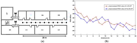 It should be noted that for the practical positioning, fading, shadowing, and dynamic environment significantly make the RSS fluctuation []. Although we have preprocessed the original RSS observations, these effects cannot be eliminated completely. Therefore, we analyze the RSS distribution in actual experimental environment. According to whether there is a wall or other obstacles between the AP and the receiver, we divide the APs into the line-of-sight APs (LOS-APs) and the non-line-of-sight APs (NLOS-APs). For convenience, for a position point, we consider the APs in the same corridor as the LOS-APs of this point, and the others as the NLOS-APs. As shown in Figure 2a, we employ a LOS-AP and a NLOS-AP, select 21 points with different distance from the APs. The total span of the points is 20 m, the interval between adjacent points is 2 m and the signal collection time is three minutes at each point. Using the RSS preprocessing method in Section 2.2, we obtain the processed RSS at different distances.