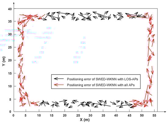 To confirm our speculation, we compare the positioning accuracy of our proposed algorithm with the LOS-APs and the NLOS-APs in the experimental field 1, which is introduced in the next section of the experimental setup and 120 TPs are selected. We use the error vectors to show the positioning performance more intuitively. As shown in Figure 3, the arrows point from the actual positions to the corresponding estimated positions, black arrows indicate the positioning errors of the SWED-WKNN with only LOS-APs, and red arrows indicate the positioning errors of the SWED-WKNN with all detected APs. We can see that the proposed SWED-WKNN method has larger positioning errors when all the APs are used. This is because the signal propagation path from the NLOS-APs is more complex, its RSS distribution may not be consistent with the signal attenuation model. Additionally, the values of the RSS from the LOS-APs and the NLOS-APs are confused. In the SWED calculation for a pair of RP and TP, the weights calculated by the RSS average values from different APs will become inaccurate, resulting in errors in the obtained SWED. To make our proposed SWED-WKNN method effective, in this paper, the positions of all APs are known and only the LOS-APs are used. Our solutions are as follows: