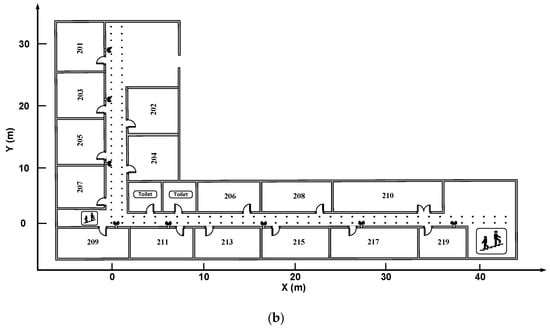 Indoor fingerprint positioning experiment environment. (a) Experimental field 1 on the fifth floor of the library building; and (b) experimental field 2 on the second floor of the academic building.