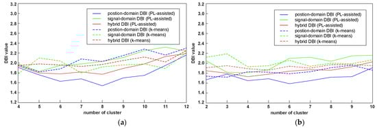 where Q is the number of the clusters, , and are the signal-domain DBI, the position-domain DBI and the hybrid DBI, respectively. As indicated in Equations (24) and (25), for each cluster, the maximum ratio value of the intra-cluster distance to the inter-cluster distance is selected, and the DBI is obtained by averaging these maximum ratio values. Generally, the maximum ratio value comes from the adjacent clusters, which is most important for evaluating clustering performance. As indicated in Equations (26), since the hybrid DBI is the square of product of the signal-domain DBI and the position-domain DBI, it can reflect both the signal relationship and position relationship of the RPs after the clustering. Clearly, a small DBI value means a good clustering performance, that is, the intra-cluster distances are small and the inter-cluster distances are large.
