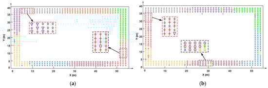 Figure 6 intuitively shows the clustering result comparison between the proposed algorithm and the k-means algorithm under the number of the clusters with the minimum hybrid DBI values in experimental fields 1 and 2; different colors and shapes denote different clusters. The red box denotes the RPs in the boundary region of adjacent clusters, and the black box denotes the RPs in the middle region of the cluster. We can see, for the two algorithms, there are both some RPs confused in the boundary region of adjacent clusters. This is because WiFi signals are influenced by a complex channel environment, which makes the RSS distribution in the boundary region not clear enough, resulting in the confusion of the RPs’ distribution. However, as shown in the black boxes, compared with the k-means, the RPs clustered by the proposed algorithm can be divided more clearly, and there are fewer outliers in the middle region of the cluster, these outliers are the RPs with similar RSS but distant positions.